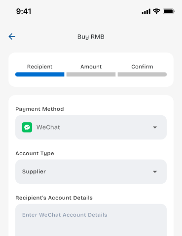 Easily transfer funds to China using AliPay, WeChatPay, or Chinese bank accounts. With our app, you can complete transactions in just a few steps, ensuring that your payments are always delivered swiftly.